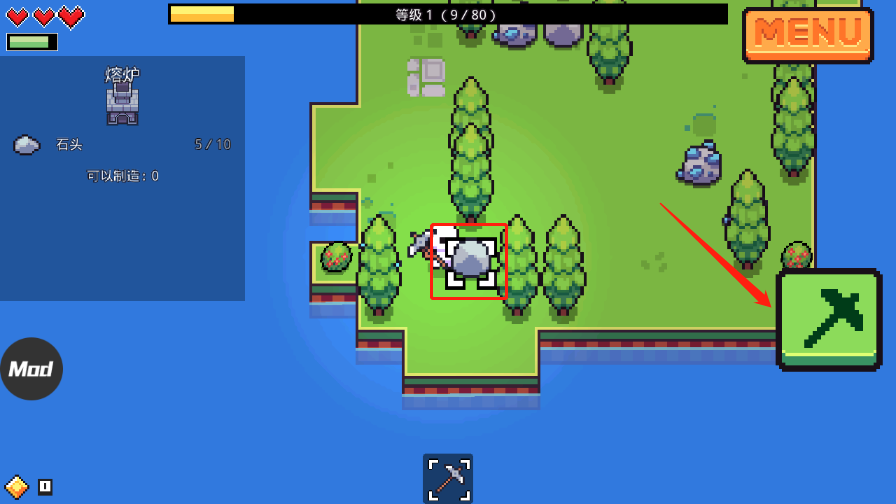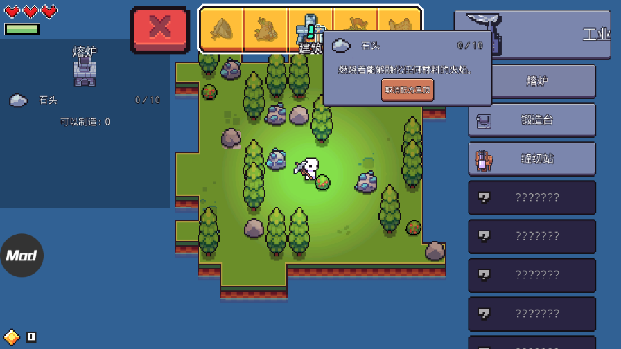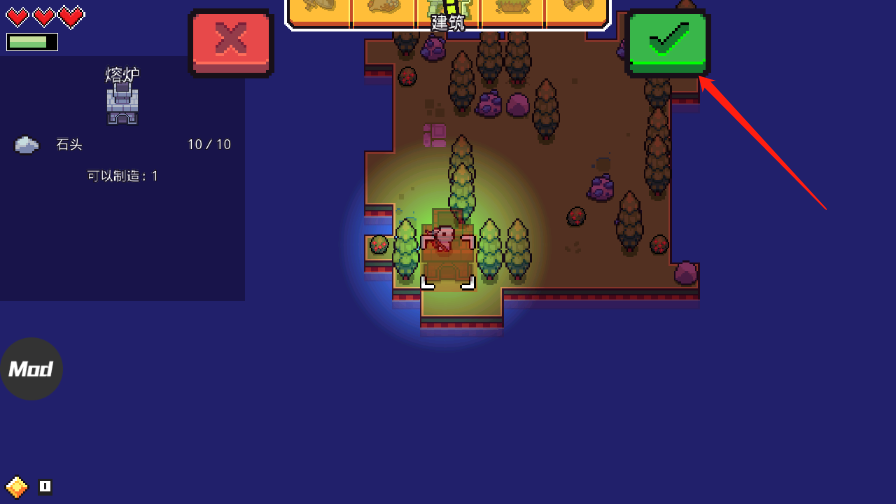 6、收集到足够石头后,回菜单→建筑,选熔炉并选位置,点击【√】确认建造。