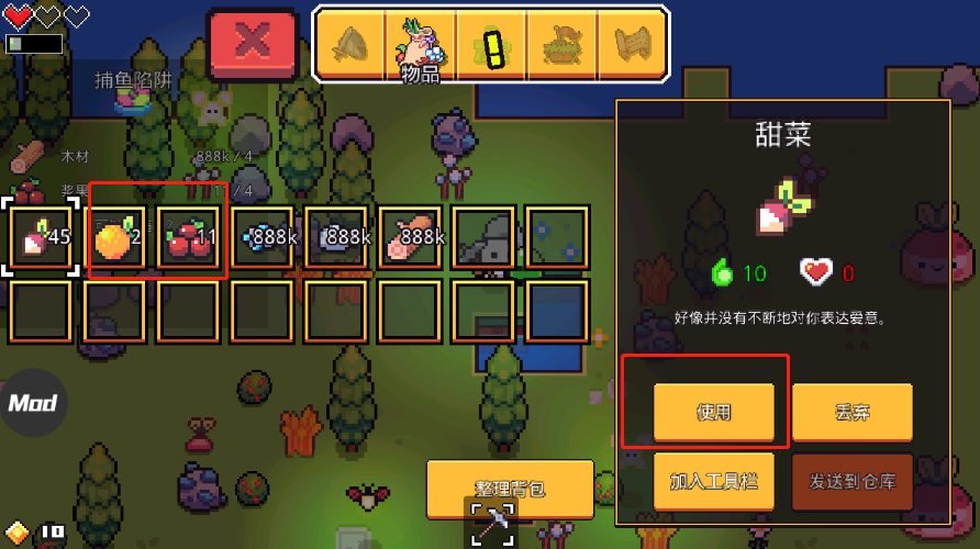 9、角色饥饿时,打开菜单选择食物并使用恢复能量,随时查看配方与背包,确保材料充足并留意角色状态。