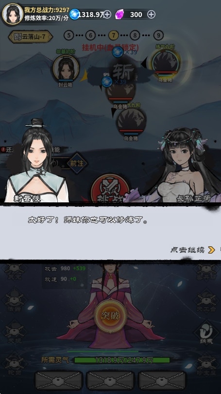 在这里可以选择技能,快速清怪,待你挑战成功后,可以选择原地挂机,也可以通过境界的突破和修为的提升,挑战更高难度的关卡。