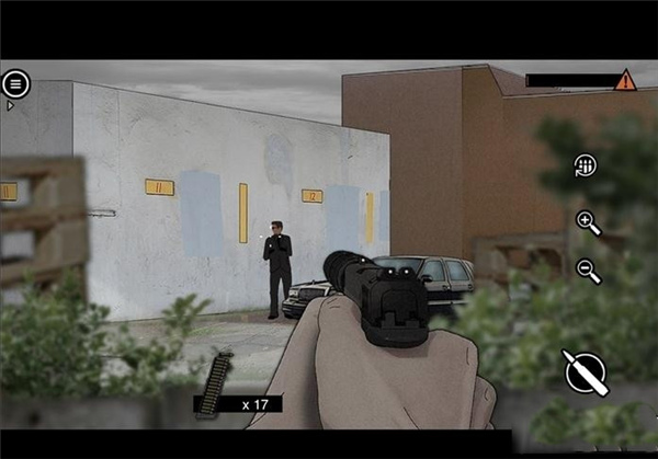 击杀第二个敌人之后,其身体会砸在轿车的方向盘上,喇叭声会一直响个不停。这个时候第三个敌人出现,玩家应迅速将准星移动到左侧靠墙的位置上,在敌人转过来的瞬间将其击杀。否则一旦让他转过来发现同伴尸体,关卡即以失败告终。不清楚具体流程的小伙伴们可以参考下图小编给出的图示照片。