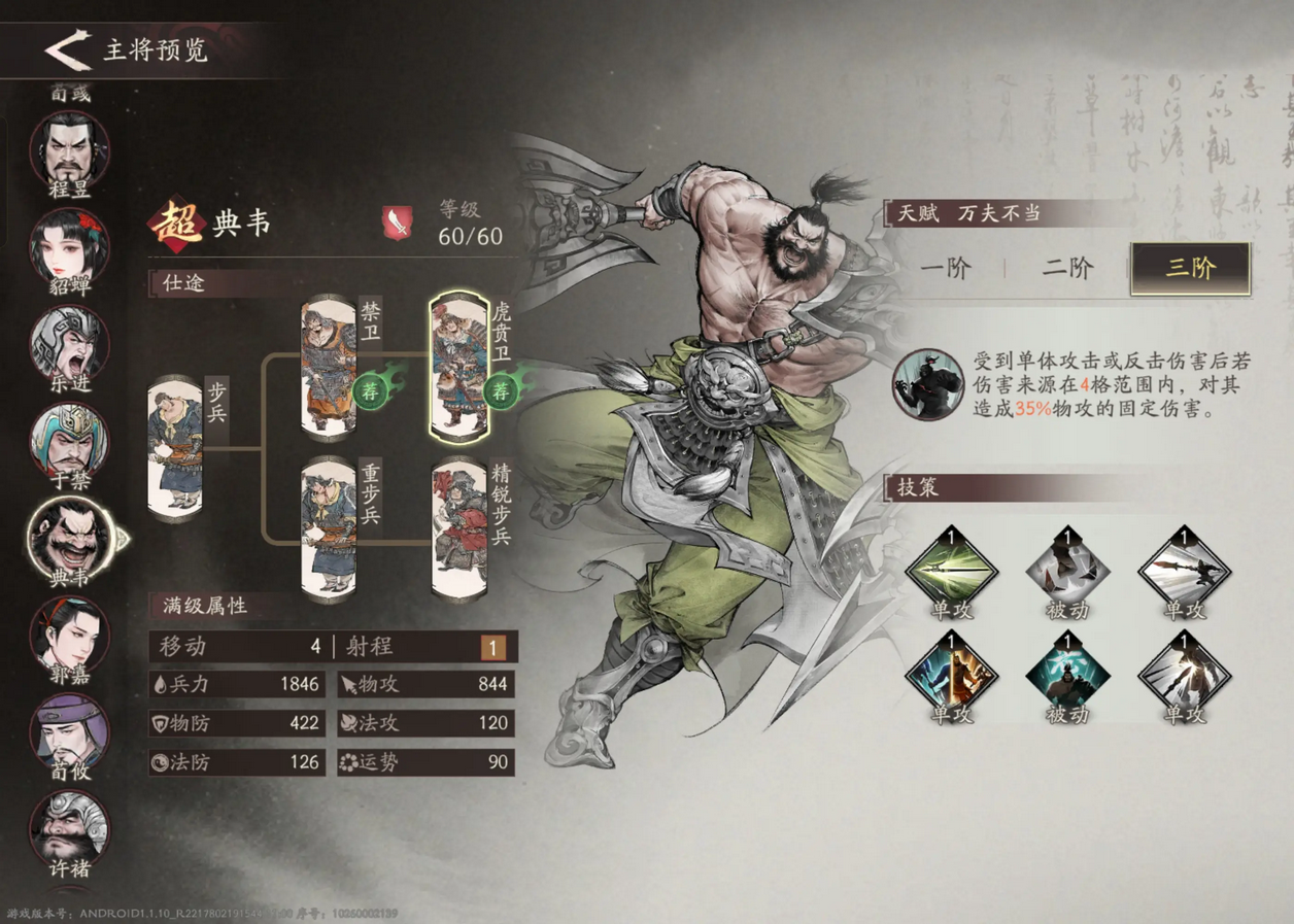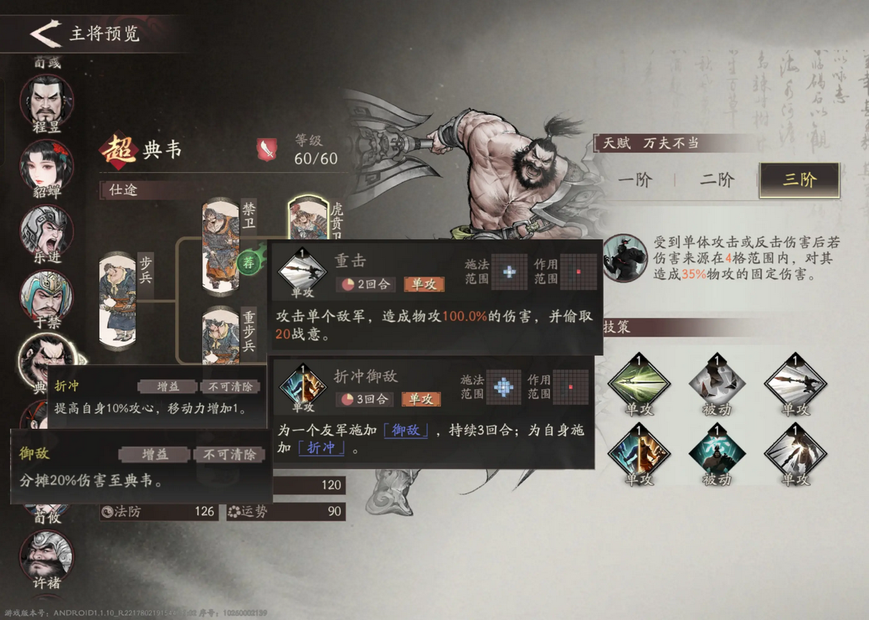资源足够的话,在前期可以把重步兵线也点开,折冲御敌这个技能在前期主将不全时功能性还是比较好的。前期推荐折冲御敌和重击。在后期没有辅助位或生存压力大时推荐阻敌,古之恶来,背水一战。而在生存压力小或者有护盾类辅助帮忙控血时推荐古之恶来,阻敌和重击。