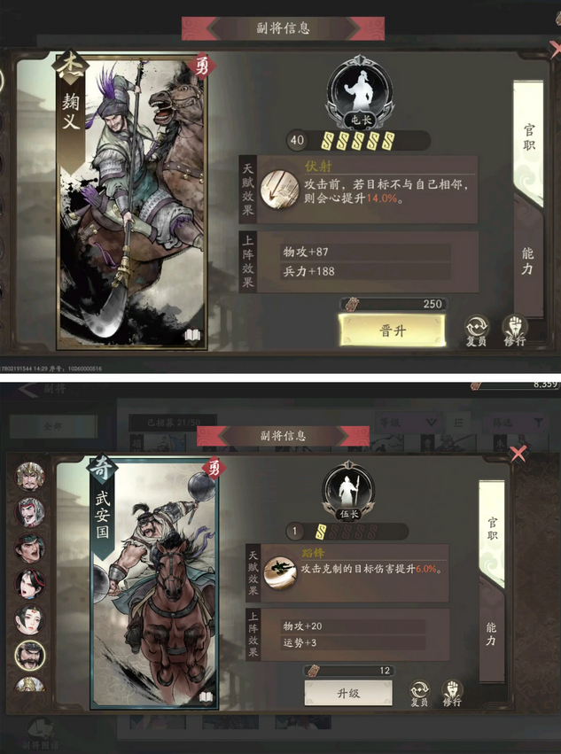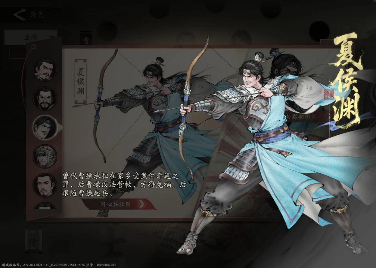 夏侯渊的核心还是暴击,所以尽量选择基础属性和天赋效果与暴击有关的。这里前期我推荐麹义或者武安国。麹义的天赋效果可以完美的契合远程暴击主将,而武安国虽是一张蓝卡,但基础属性十分契合夏侯渊,而且获得十分简易。可以完美作为过度使用。后期的话较为通用的臧霸和阎柔无疑是优选。