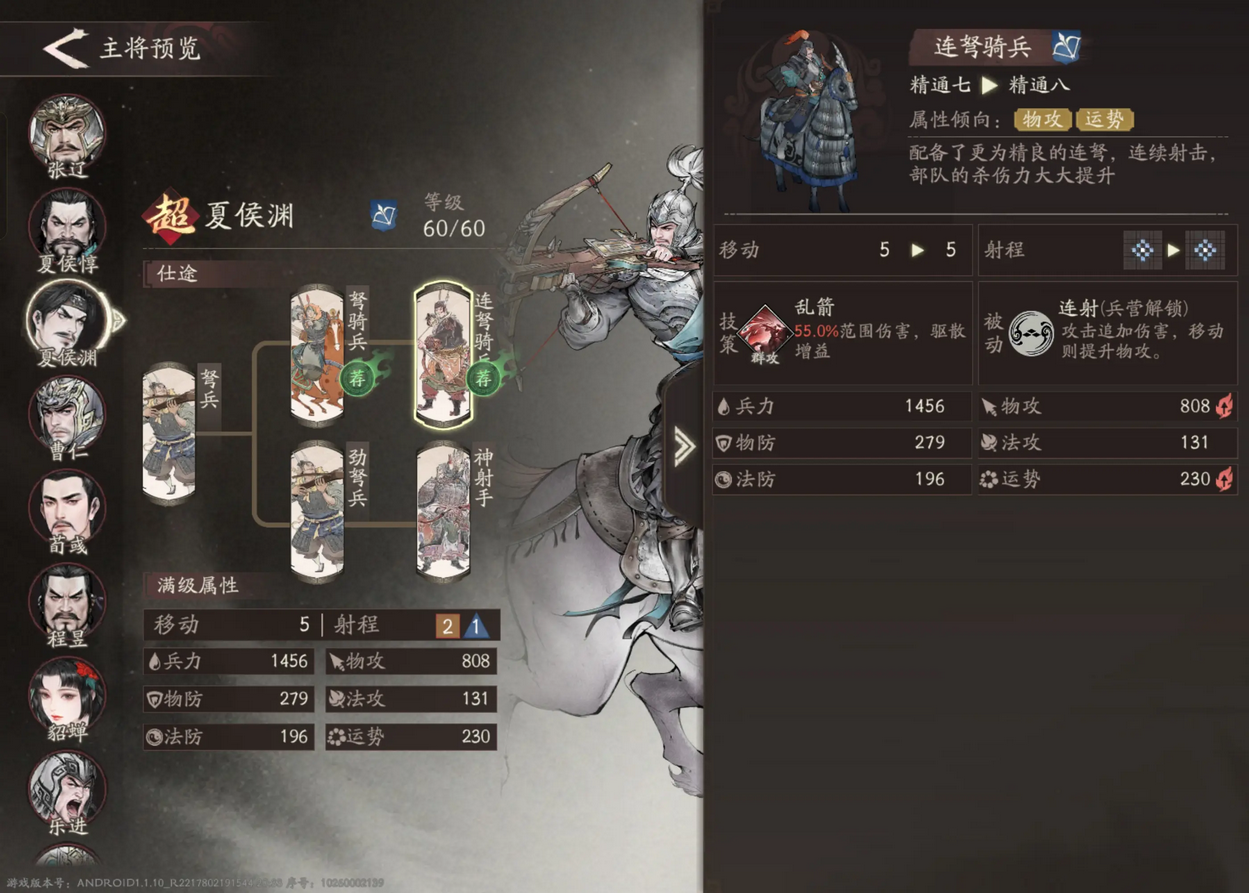关于夏侯渊最著名的一句话是“典军校尉夏侯渊,三日五百,六日一千。”在游戏里他的优势兵种也是骑兵。和夏侯惇正相反,注重单体爆发的夏侯渊不需要更大的攻击范围,攻击范围换为移动力对较脆的夏侯渊来说优势更大。