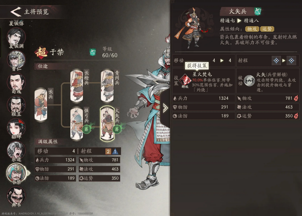 作为弓手,于禁也是吃高暴击的运势与会心。其次选择物攻高的装备。