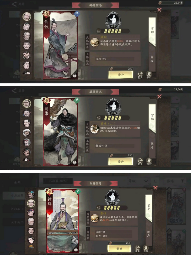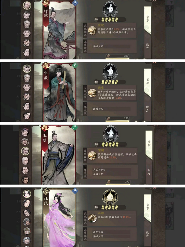 前期推荐杜氏作为过渡,一方面可以增加自身奶量,另一方面有对法攻基础的加持。后期可视情况王朗,华歆,许攸等。