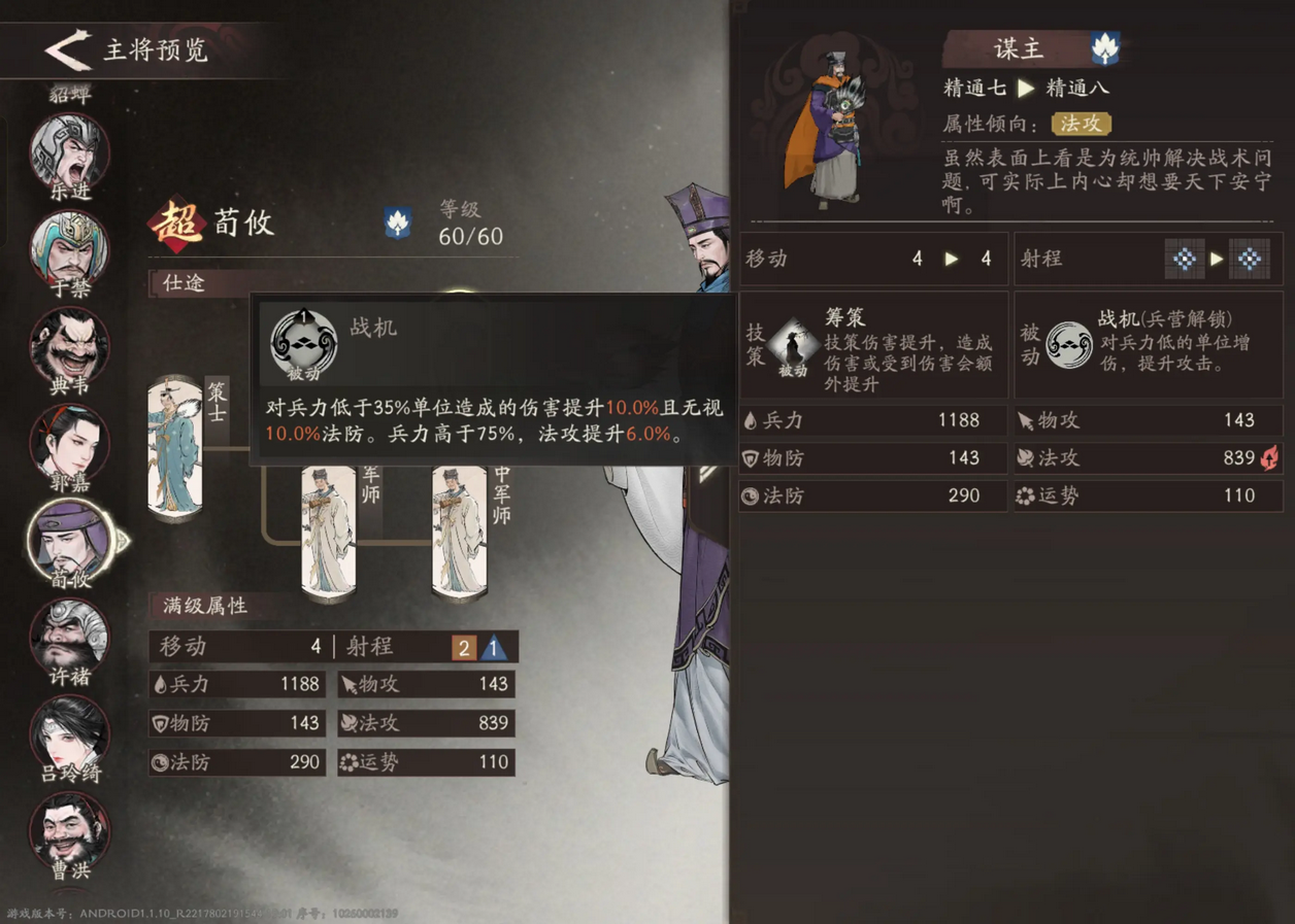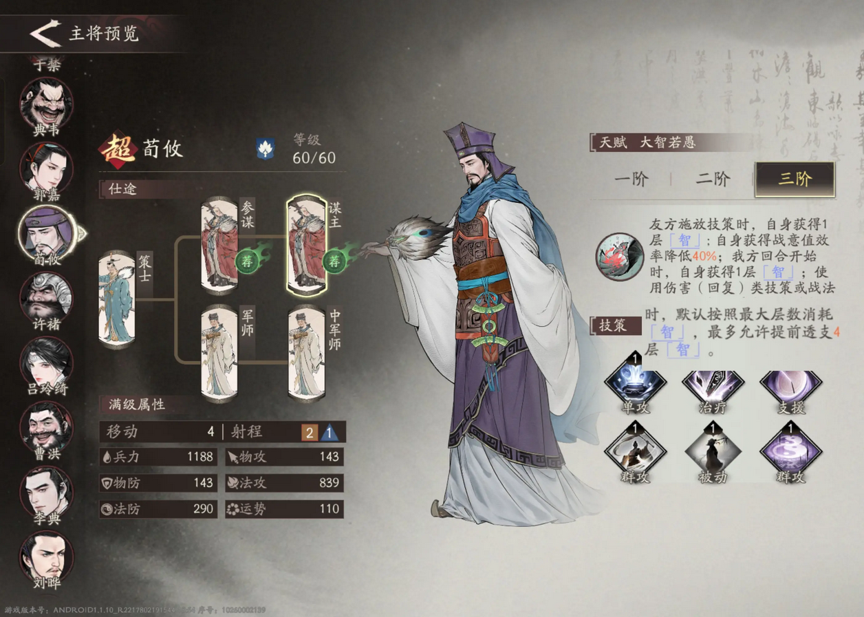 荀攸的被动是放弃战法的使用,在队友多次使用技能的情况下打出爆发的高输出法师。