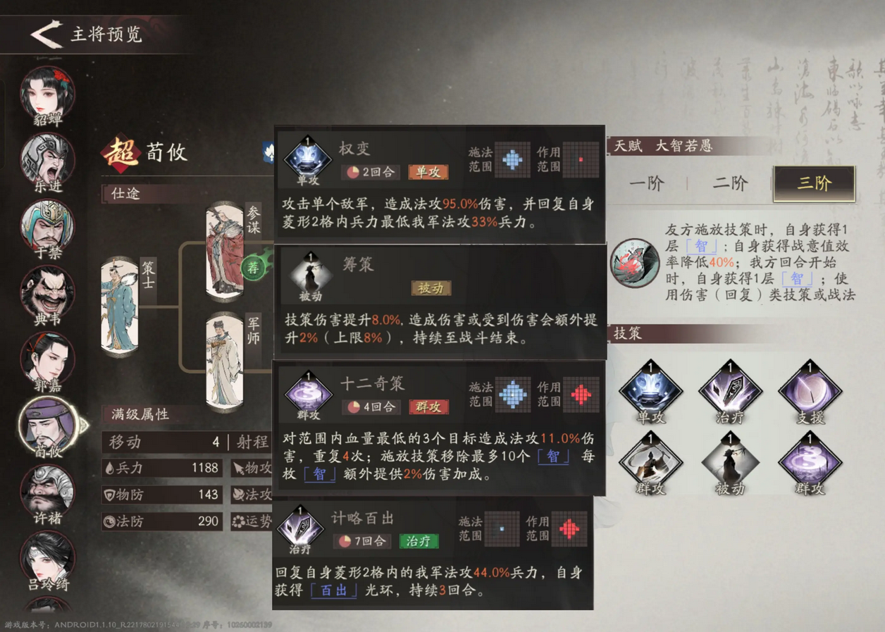 常规流:前期推荐权变和抚宁内外。后期加上十二奇策作为爆发。放弃抚宁内外的原因是都是减少技能CD类技能,综合来说计略百出的群体增益对『智』的叠加更有帮助。如果队友的技能cd大多不超过2回合,则可把计略百出换成筹策来追求更高输出,带权变的原因是普攻是无法消耗【智】的,必须带有短CD的技能来保证输出。