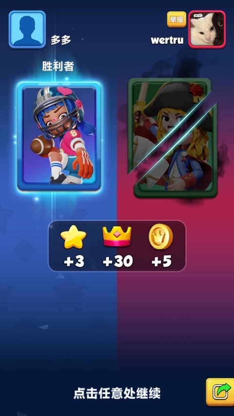 双方回合都结束后,直接统计三消分数,分数高的一方获胜,胜利的一方获得皇冠等奖励,失败的一方失去皇冠,并被撕掉卡牌。