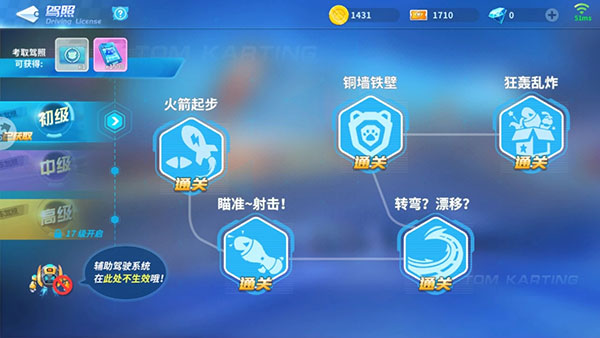 以初级驾照为例,玩家需要进行火箭起步、瞄准射击、转弯漂移、铜墙铁壁与狂轰乱炸五个小比赛,每个比赛都有该比赛需要完成的挑战目标,但共同的要求就是必须按时完成比赛,每个关卡的难度均不同,有些关卡不仅挑战目标十分有难度,而且关卡路线十分崎岖,让玩家难以完成比赛。玩家通过最后一关狂轰乱炸之后便能一个蓝色的驾照徽章以及改装点了,驾照徽章便是驾照的象征。